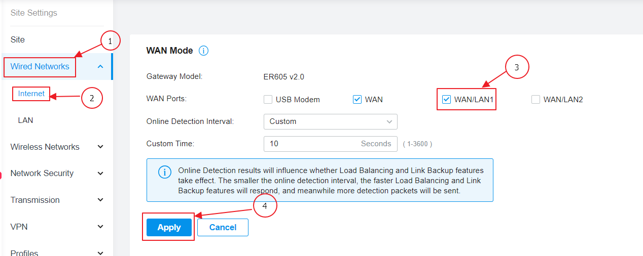 위 사진과 같이 WAN/LAN1 설정을 합니다.